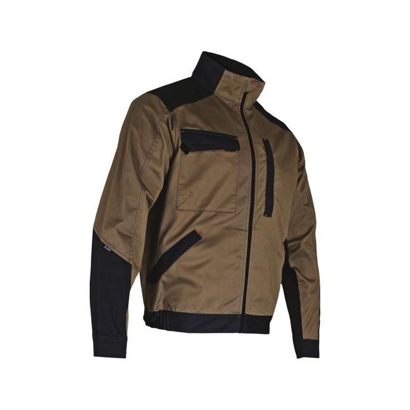 Sergé 60% coton 40% polyester, 280 g/m². Col montant, empiècements contrastants, 1 poche poitrine plaquée et zippée, 1 poche plaquée avec pince et fermée par bande auto-agrippante, 2 poches passepoilées, fermées par rabats et boutons pressions. Poignets fermés par pressions, fermeture à glissière, ceinture élastiquée côtés. Coloris : gris/noir Taille : 1 à 5