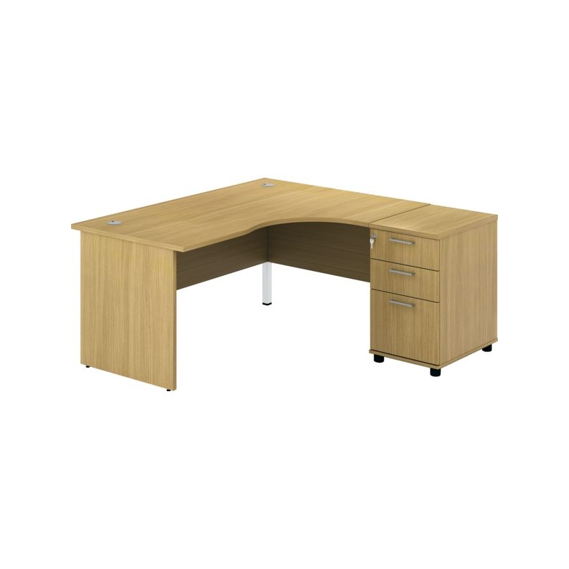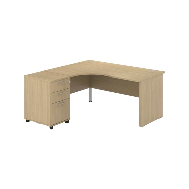 Bureau droit avec plan de travail de 25 mm d'épaisseur. Compatible avec le chargeur QI sans fil réf. 100583, le bloc encastrable prise électrique + USB réf. 100584, et la goulotte réf. 100582, nous consulter. 2 vérins de réglage discrets sous chaque pied panneau. 2 perçages pour passage câble avec obturateur, goulotte passe-câbles (en option). Caisson mobile 3 tiroirs à fermeture centralisée, dont un pour dossiers suspendus. Coloris : chêne blanchi. Livré démonté.