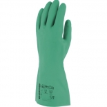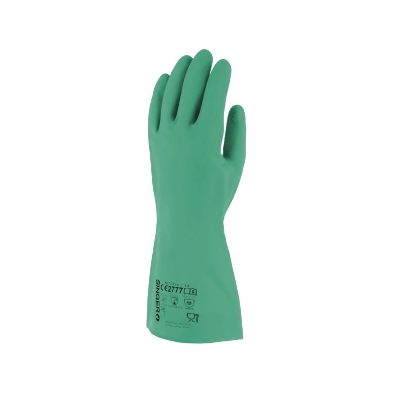 Enduction totale en nitrile. Sans support, intérieur floqué coton. Bord droit, finition gaufrée. Contact alimentaire Risques chimiques Manutention légère / Milieu humide Applications métiers : industrie chimique, nettoyage industriel, assainissement, pêche industrielle, sablage et grenaillage, manipulation et conditionnement de produits alimentaires Longueur : 300 mm Épaisseur : 0,38 mm Taille : 7 à 11 Norme : CE Cat III - EN 374-1 type A (AJKLMNO) - EN 374-5 - EN 388 (3101X)