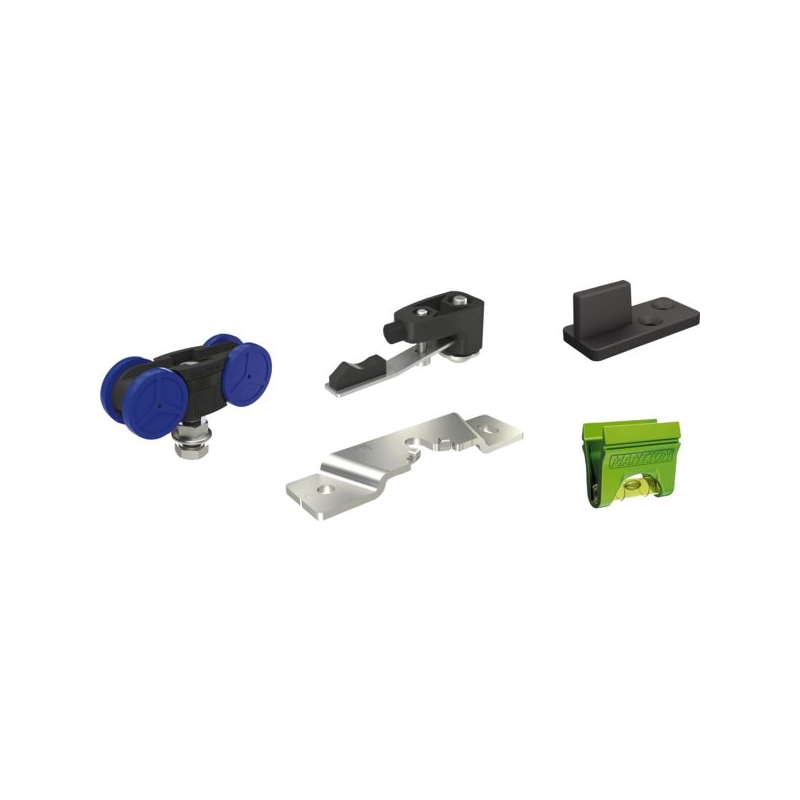 Garniture pour 1 porte de 81 à 120 Kg maxi comprenant : - 2 montures 13232 (montées sur roulements à billes), - 2 platines 13036, - 2 butées d’arrêt réglables 11213, - 1 guide au sol 1103R, - 1 Buly (niveau à bulle). Conditionnement : boîte Colisage : 6 pièces