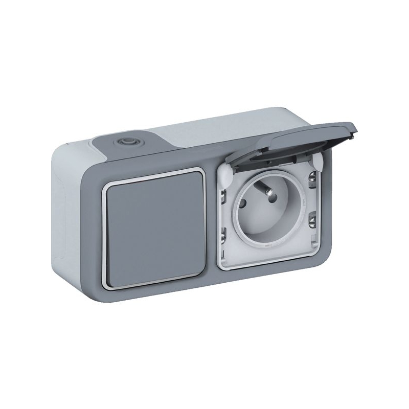 Convient pour extérieur et locaux humides. Bornes automatiques pour raccorder les fils sans outil. Perforable pour câble ou tube. Prise 2P + T en saillie. Indice de protection : IP 55