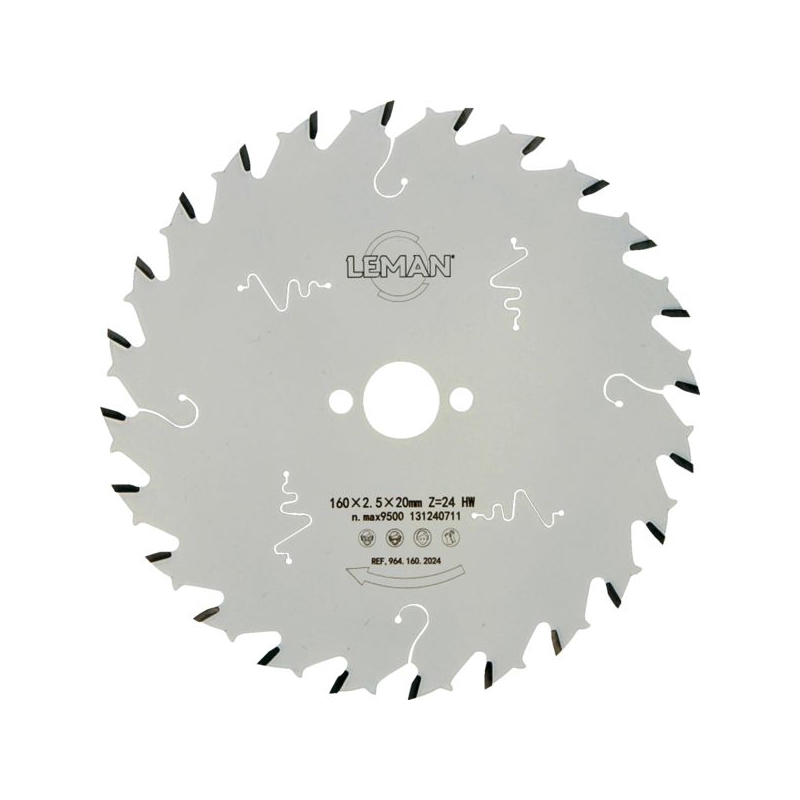 Lame de scie carbure, denture alternée pour le travail du bois. Corps en acier traité et rectifié, tensionné.