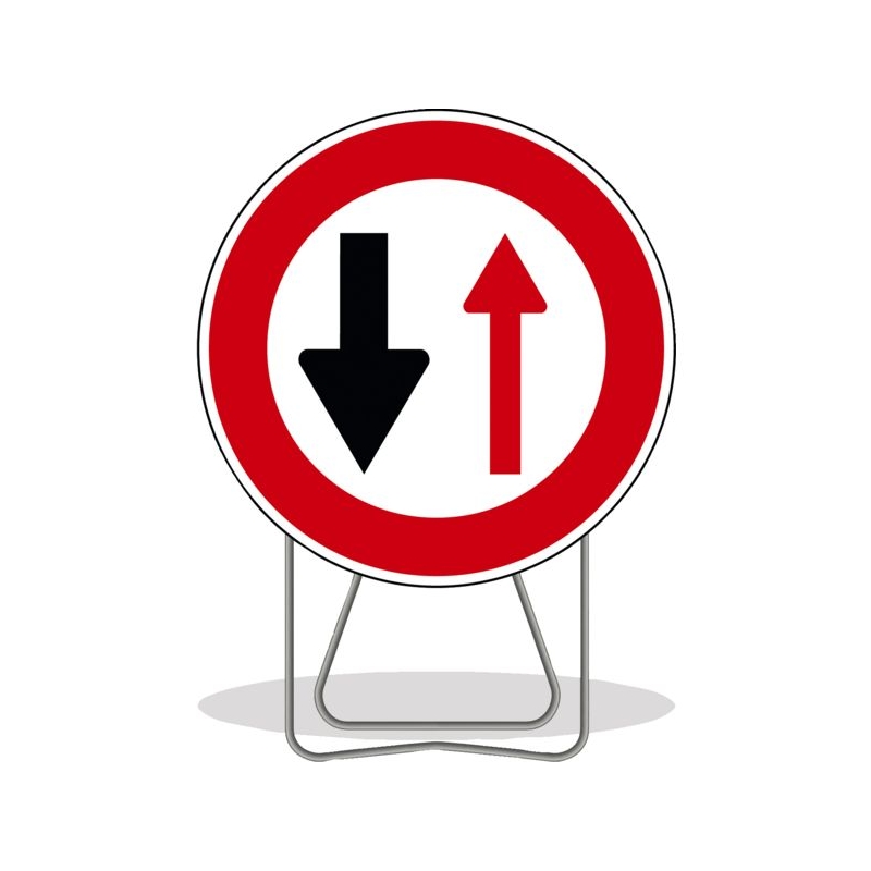 Pour une signalisation temporaire de prescription. En acier galvanisé, sur pied métal solidaire. Forme ronde - classe T1. Norme : NF-TSI-03