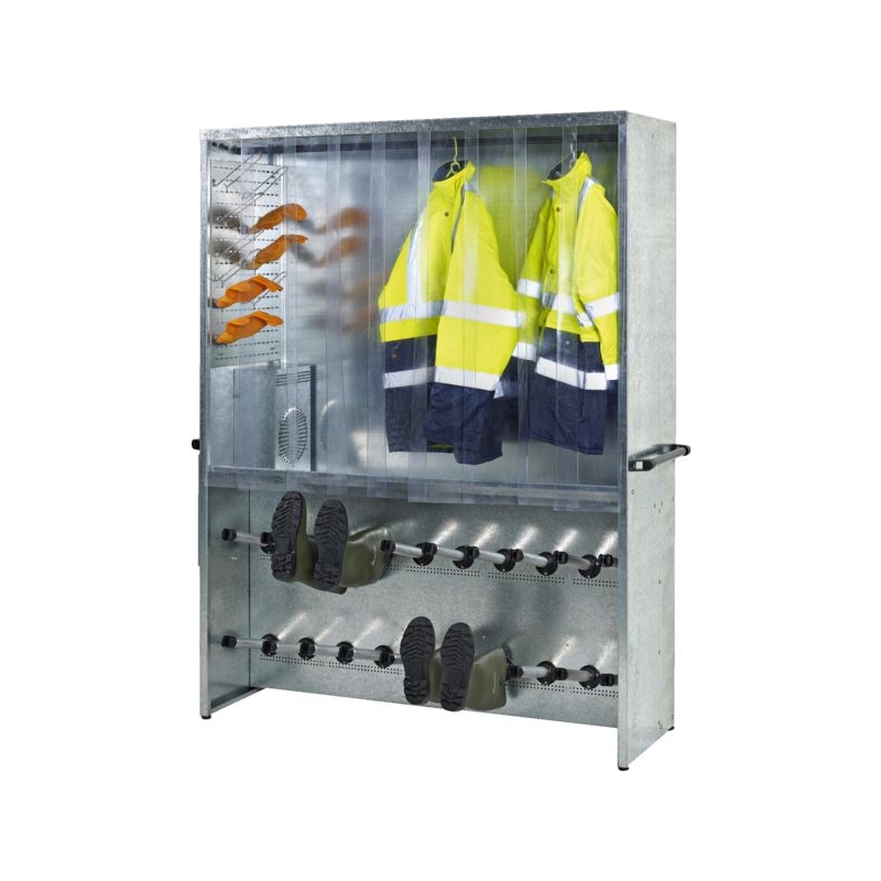 Penderie collective chauffante avec sèche-bottes. Structure monobloc galvanisée avec rideaux en PVC translucide et système de ventilation d'air chaud. Permet de sécher simultanément vêtements de travail (penderie) et chaussures pour 10 personnes. Support gants en option. Puissance : 1,6 kW (ventilation + chauffage temporisés) Temporisation : 1 à 4 h L x H x P : 1550 x 1970 x 500 mm