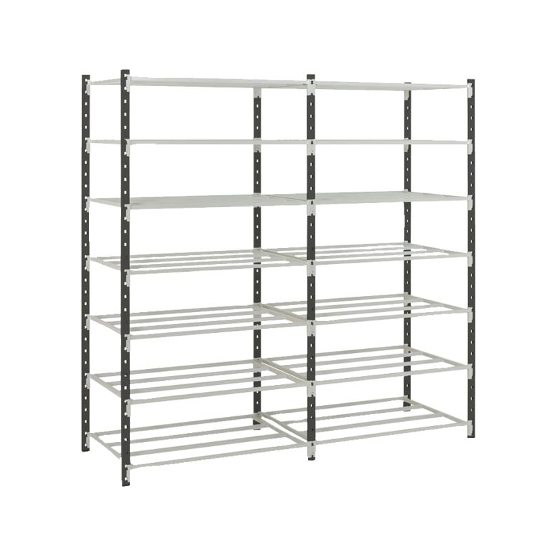 Composé de 5 niveaux en tablettes tubulaires à connecteurs réglables au pas de 62,5 mm. Idéal pour le stockage de pièces mécaniques, bacs plastiques, outillage. En option, dessus de tablette préconisés pour le stockage de petites pièces, en isobois de 2,5 mm d'épaisseur. Utilisation en simple et double face. Tablette monobloc rigide, permettant un montage et démontage très rapide, sans outils ni visserie. Finition peinture époxy montants bleus et tablettes gris perle. Livré démonté. Autres dimensions, configurations et coloris disponibles sur consultation. Capacité de charge : jusqu'à 250 kg uniformément réparti selon configuration. H x l : 2000 x 1000 mm Poteaux gris anthracite (RAL 7024) et tablettes gris perles (RAL 7035)
