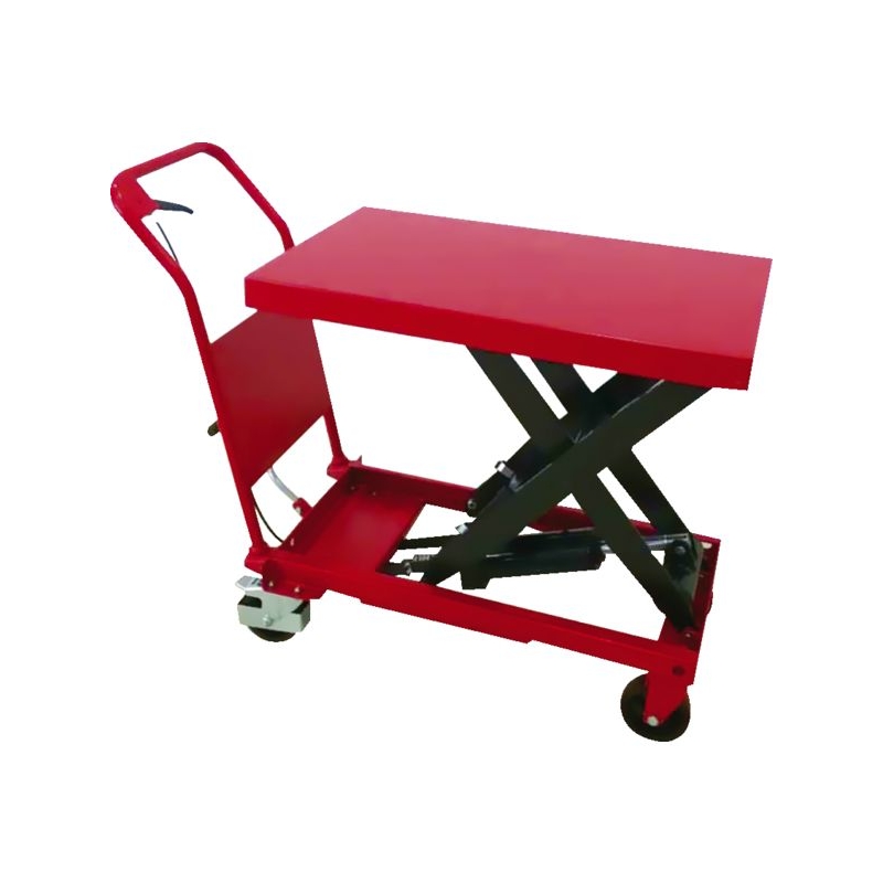 Commande de levage à pédale par vérin hydraulique. Commande de descente manuelle par levier. Roues à bandage caoutchouc 2 fixes et 2 pivotantes à frein. Capacité de charge : 500 kg Dimensions plateau : 815 x 500 mm Hauteur mini/maxi : 280/900 mm Poids : 82 kg 60% recyclable