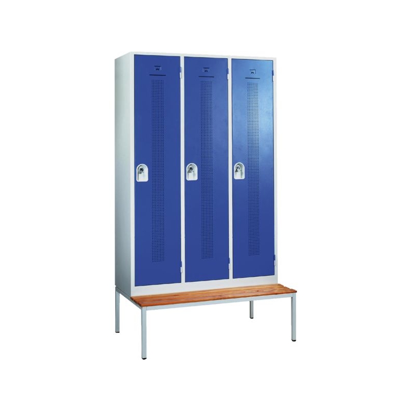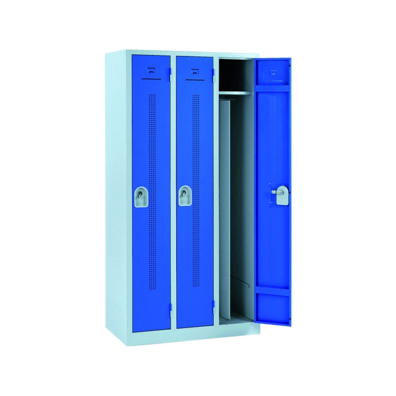 Porte renforcée par un raidisseur vertical, aérations. Porte-étiquettes, tringles portes cintres avec crochets, fente courrier et fermeture encastrée par moraillon débrayable porte-cadenas (serrure à clé en option). Hauteur sur socle : 1800 mm Profondeur : 500 mm Coloris : corps gris, porte bleue Option disponible : pieds emboitables en acier ou en inox