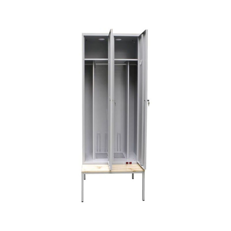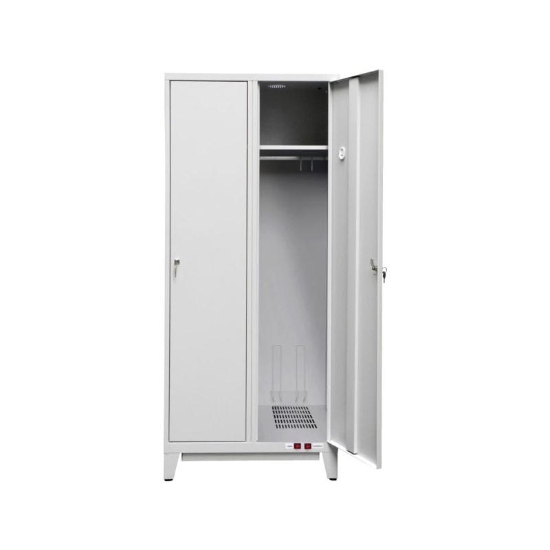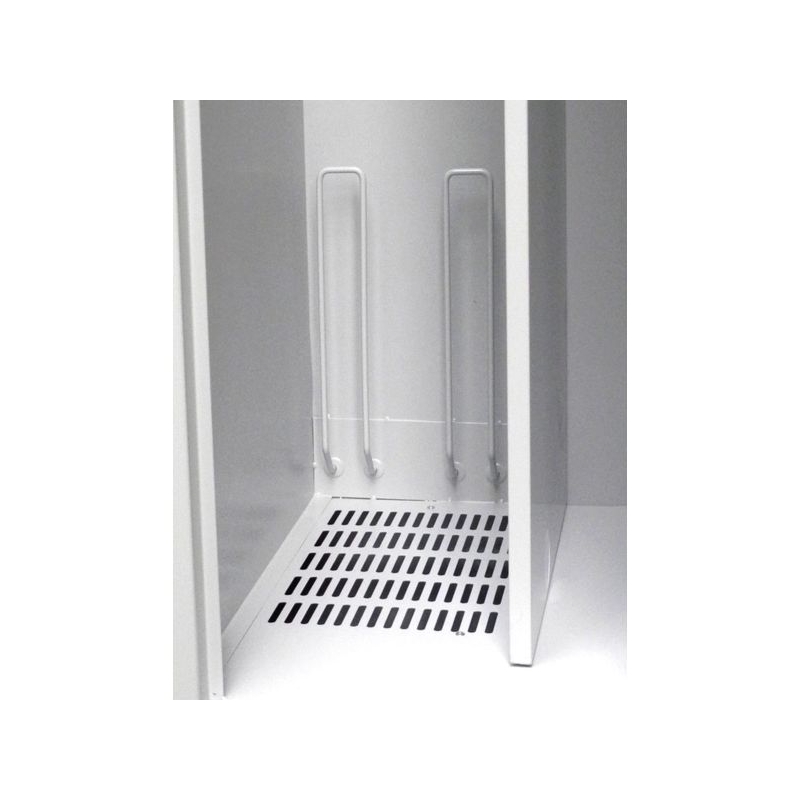 Pour sécher les vêtements de travail. Temps de séchage de vêtements humides estimé en 4-5h. En tôle acier, peinture époxy avec traitement anti-corrosion. Pieds avec vérins de réglage. Tablette soudée, penderie avec cloison de séparation pour vêtements de ville et vêtements de travail. Porte renforcée, fermeture par verrou cadenassable. Aérations. Vestiaires connectables en série. Débit d’air : 150 m³/h Temporisation : 5 h L x H x P : 800 x 1940 x 490 mm Options, version 1000 W et sur socle banc, sur consultation.